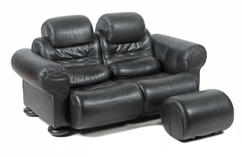 COR, Deutschland, 1980/90er Jahre, brutalistisches Design, 2 Sitzer Sofa mit Fußrolle, allseitig gepolstert, schwarzer Lederbezug, die aufgelegten Kopfstützen unterseitig mit Herstellerbezeichnung, auf gequetschten Kugelfüßen aus Metall, schwarz lackiert, dazu Fußrolle auf schwarz lackierten Metallstegen, HxBxT: ca. 90/175/105 cm.