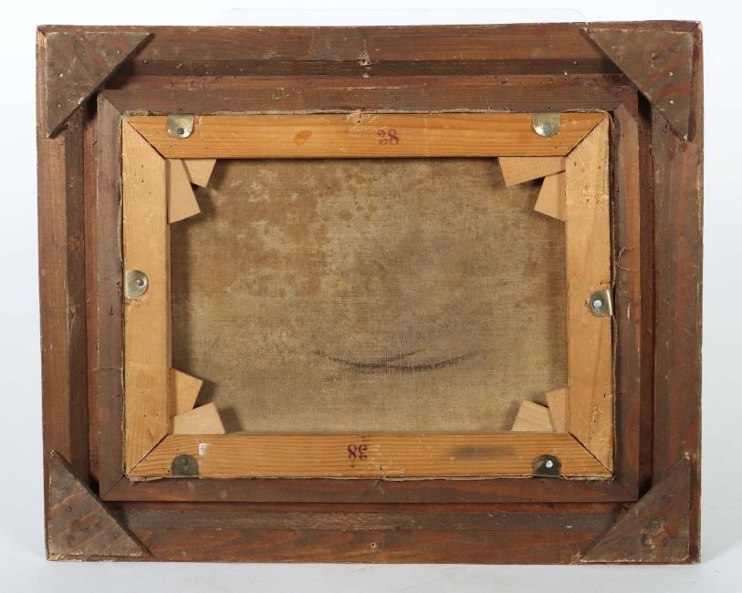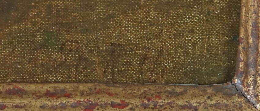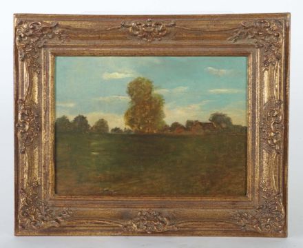 Darmstadt 1841 - 1921 München, Maler. "Landschaftsansicht" mit Gehöft und blauem Himmel, unten rechts schwach sign., Öl/Leinwand, HxB: 28,5/39 cm. Altersspuren, Ret.. Mit Rahmen.