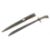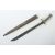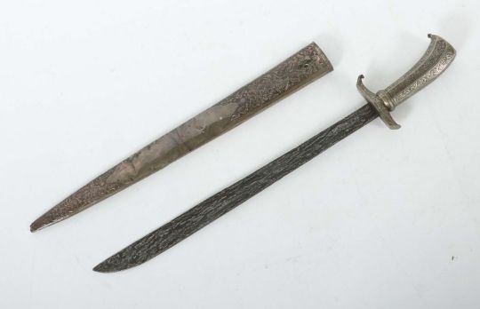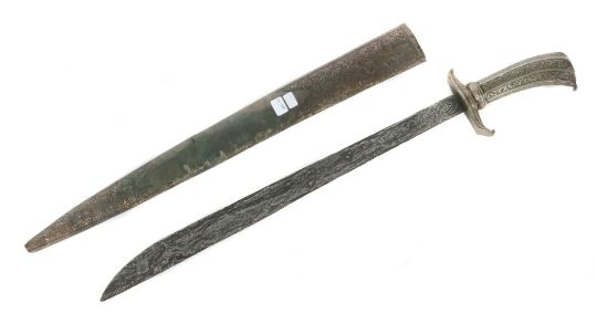 Indonesien/Java, 19. Jh., Kurzschwert bzw. Haumesser, dunkle Klinge mit silbriger, kraftvoller Pamor-Struktur, gerader Schneide und zur Schneide hin gebogener Klingenspitze, Heft mit Parier und achtseitigem Querschnitt aus Metall mit gepunztem Floraldekor in Streifen, L: 39/50 cm + Scheide mit Blechummantelung, im Mund- und Ortsabschnitt beidseitig mit getriebenem Rankendekor. Wohl Marriage, Scheide mit Dellen und besch. Spitze, min. schartig. Provenienz: Stuttgarter Privatsammlung außereuropäischer Kunst.