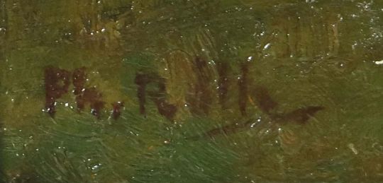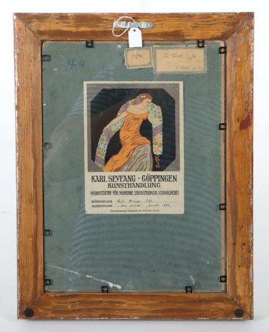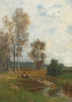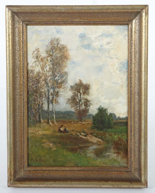 Darmstadt 1841 - 1921 München, Maler. "Schäferpaar mir der Herde", am Flusslauf in herbstlicher Stimmung, unten links sign, rückseitig Etiketten, Öl/Karton, HxB: 30/22 cm. Altersspuren, rest.. Mit Rahmen.