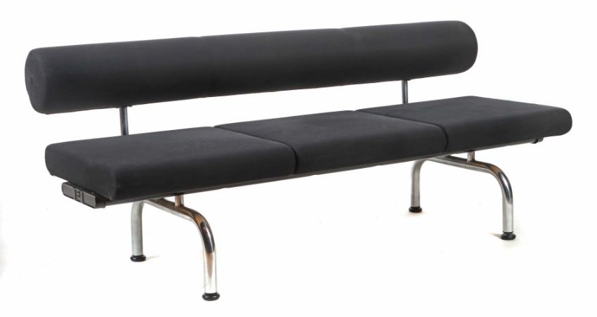 Dreisitzersofa "Pipeline" für Erik Jorgensen Mobelfabrik Svendborg, Dänemark, 1980er Jahre, mit Klebeetikett, modulares System durch Schraubverbindung (Schrauben nicht beiliegend) erweiterbar zu einer Sitzlandschaft, das Gestell aus schwarz lackiertem und aus verchromtem Stahlrohr auf höhenverstellbaren Kunststofffüßen, die Sitzpolsterung auf Holzplatte, zylindrische Rückenpolster, gewebter Textilbezug in Schwarz, HxBxT: ca. 75/180/73 cm. Alters- und Gebrauchsspuren, Flecken.