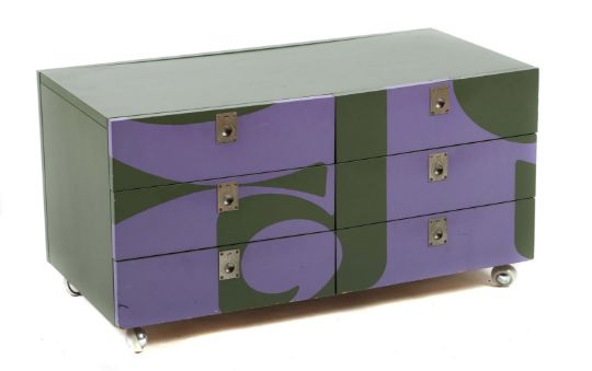 1970er, Spanplattenbau, außenseitig grün laminiert, die Front mit zeichenartigem Design in Hellviolett, 2x3 Schubladen, messingfarbene Metallbeschläge mit einklappbaren Ringhenkelgriffen, der Korpus auf schwenkbaren Rollen, HxBxT: 47/90/45 cm. Stärkere Gebrauchsspuren/Abplatzer, Metall mit Oxydationsspuren.