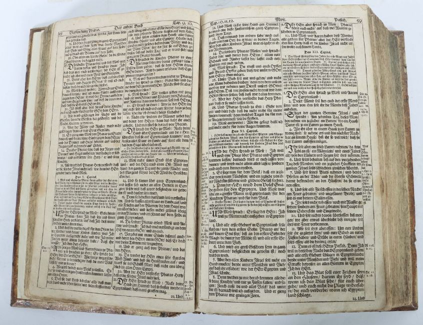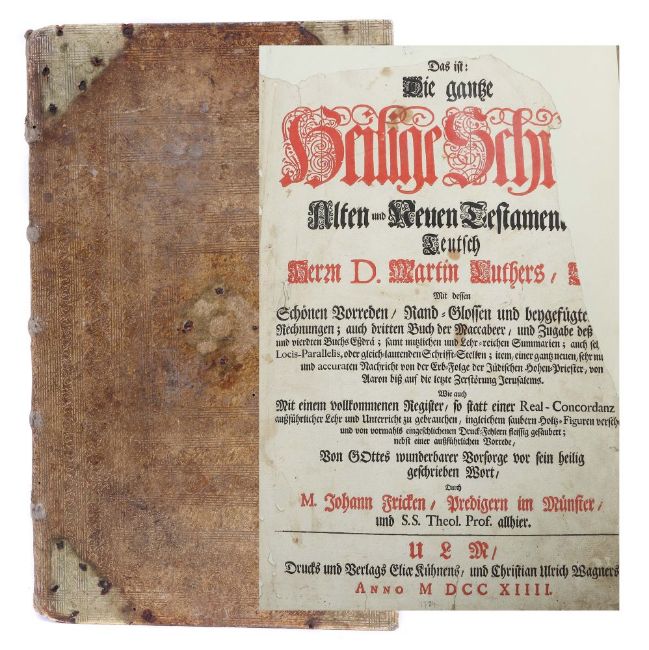 Das ist: Die gantze Heilige Schrifft Alten und Neuen Testaments, Ulm, Kühnen, 1714, mit zahlr. Textabb., geprägter Originaleinband auf 5 Bünden, Folio. Stärkere Altersspuren, part. besch./fleckig, Frontispiz und Titelblatt unvollständig, handschriftliche Eintragungen, Schließen fehlend.