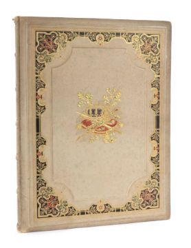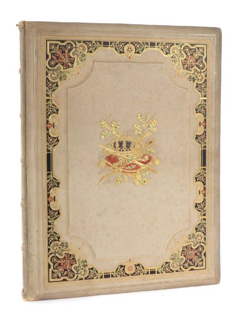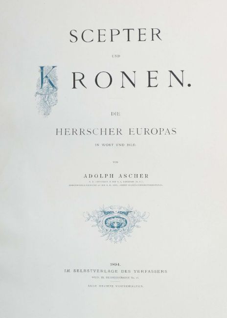 Scepter und Kronen - Die Herrscher Europas in Wort und Bild, Selbstverlag, 1894, mit 41 Lichtdrucktafeln, umgehender Goldschnitt, reich gezierter Originaleinband, Folio. Alters- und Beriebsspuren.