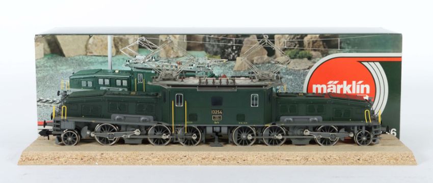 Märklin, Spur 1, Nr. 5736, schweizer Krokodil bez. 13254, grün, im OK auf Spanholzschiene, bespielt, part. Altersspuren, 1 Bügel an Treppe angebrochen (vollständig vorhanden), auf Funktion nicht geprüft, Karton m. leichten Lagerspuren.