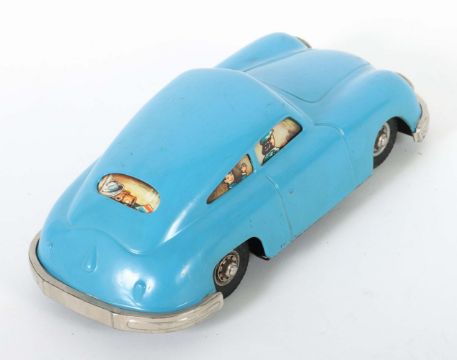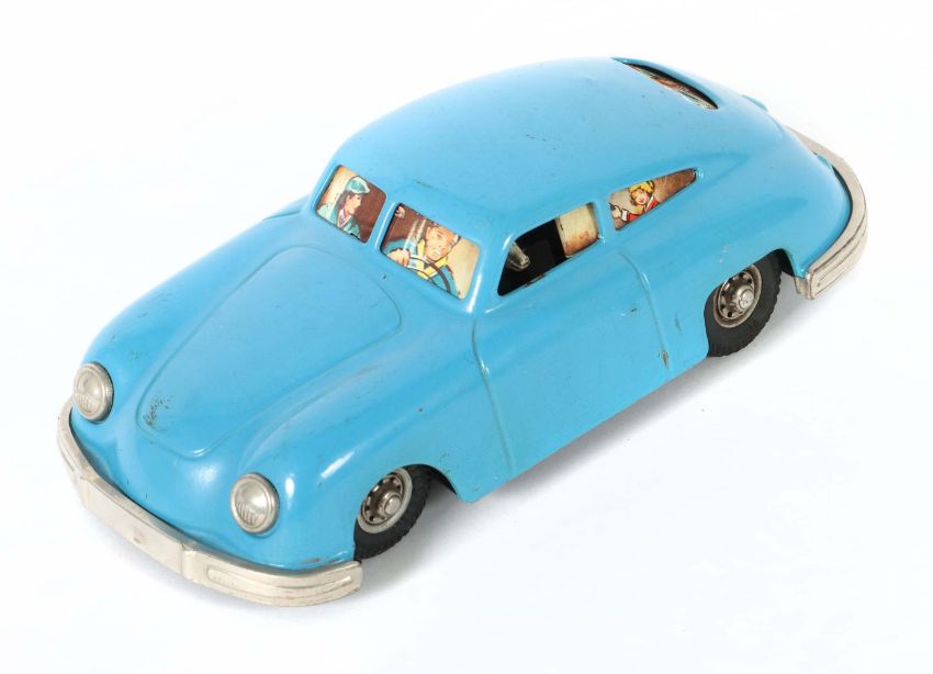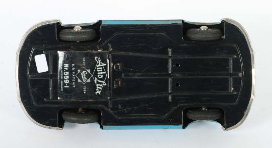 Gescha, gegr. 1924, bez. Autolux Nr. 559-1 made in Western Germany, D. B. Patent; Blech, blau, lithografierte Fenster, auf der Fahrerseite ein Hund aus Masse, Friktionsantrieb defekt, der Hund bewegt sich beim Anschub dennoch. L: 21,5 cm. Leichte Altersspuren.