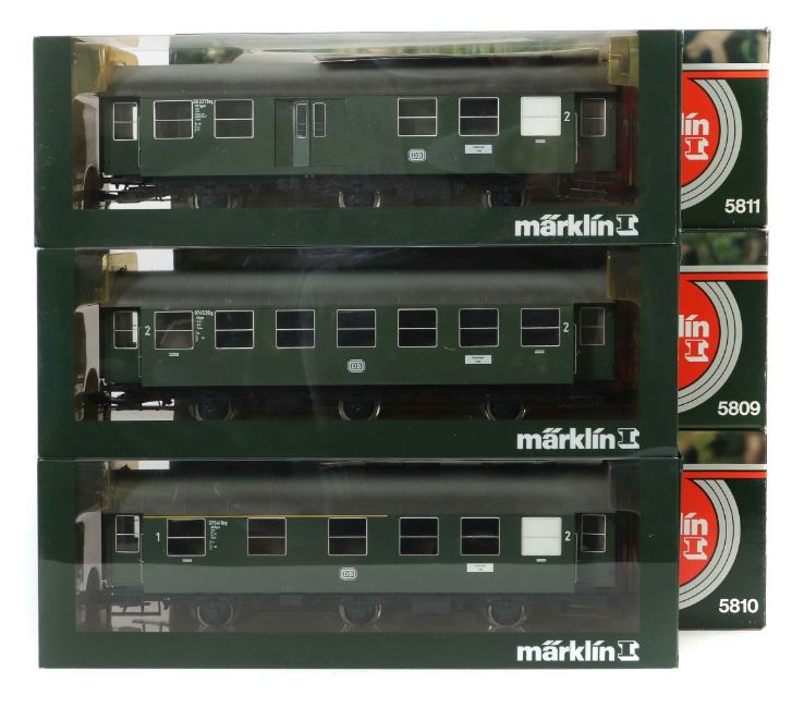 Märklin, Spur 1, Nr. 5809 Umbauwagen 2. Kl. der DB; Nr. 5810 Umbauwagen 1./2.Kl. der DB; 1 x Nr. 5811 Gepäckwagen der DB; je im Ok mit Blisterverpackung, kaum bespielt, kaum Altersspuren, OK part. m. min. Lagerspuren.