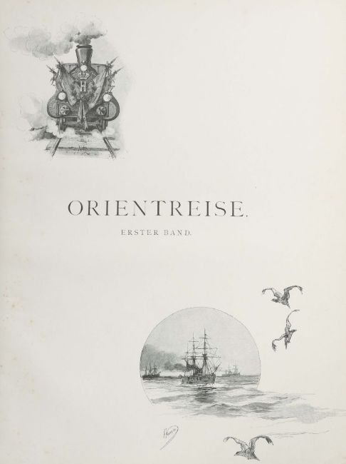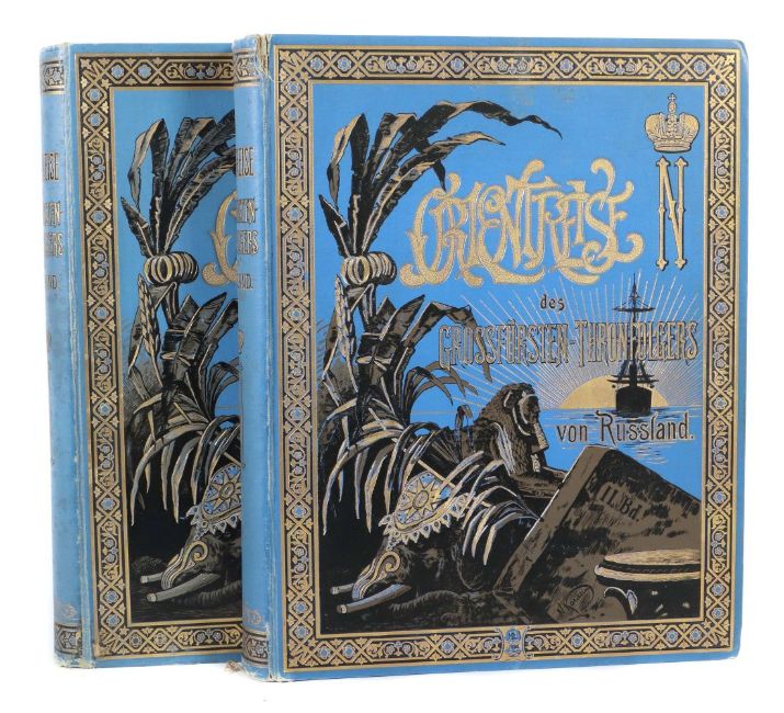 Orientreise seiner kaiserlichen Hoheit des Grossfürsten-Thronfolgers Nikolaus Alexandrowitsch von Russland 1890-1891 im Auftrage seiner kaiserlichen Hoheit bzw. Orientreise seiner Majestät des Kaisers von Russland Nikolaus II, als Grossfürst-Thronfolger 1890-1891 im Auftrage seiner Majestät, Leipzig, Brockhaus, 1894/99, 474+477 S. + Verzeichnisse, mit Portraits, Heliogravüren, zahlr. tls ganzseitigen Holzschnitten und Karten, illustr. und goldgeprägter Originalhalbleinenband, umgehender Goldschnitt, Folio. Stärkere Altersspuren, part. besch./fleckig.
