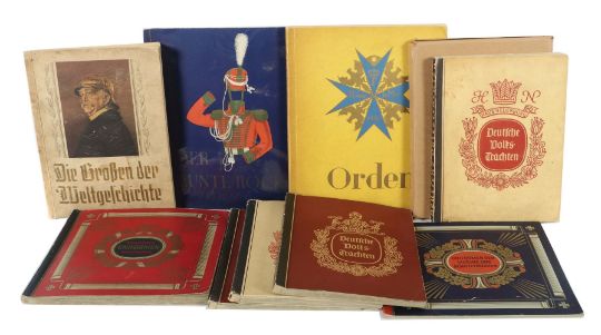 je 2 x "dt. Volkstrachten", Zuban und Haus Neuerburg; "die großen der Weltgeschichte", Eckstein-Halpus; "Bilder dt. Geschichte" Hamburg-Bahrenfeld im Schuber; Waldorf-Astoria: "Orden", "Uniformen der Marine und Schutztruppen", "Uniformen der alten Armee"; "der bunte Rock", Haus Neuendorf. Altersspuren, teils unkomplett.