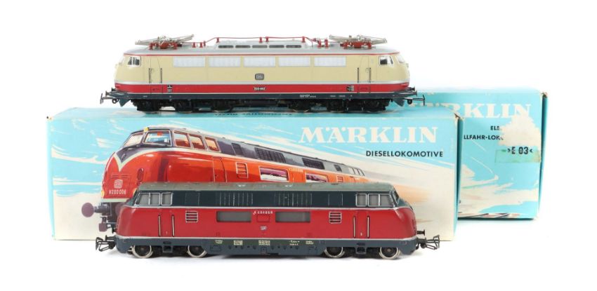 Märklin, Spur H0, 1 x Nr. 3021, Diesellokomotive V200 der DB, Guss-Gehäuse, BZ: 1966 - 1968, Betriebsnr. V200 056, OK; 1 x Nr. 3053, Schnellfahrlokomotive BR 103 der DB, Kunststoff-Gehäuse, BZ: 1966 - 1968, Betriebs-Nr. E 03 002 auf erhabenen, schwarzen Schildern, OK m. Einriss; bespielt, part. Altersspuren, auf Funktion nicht geprüft.