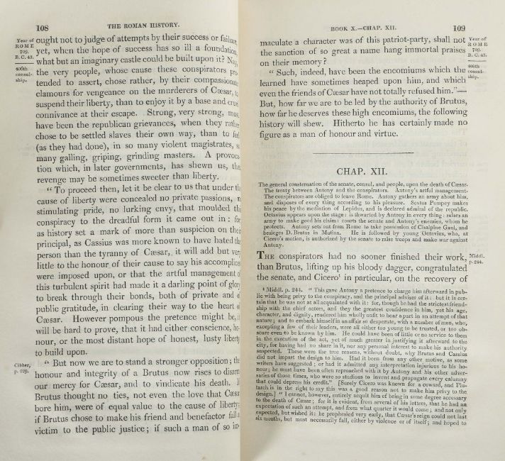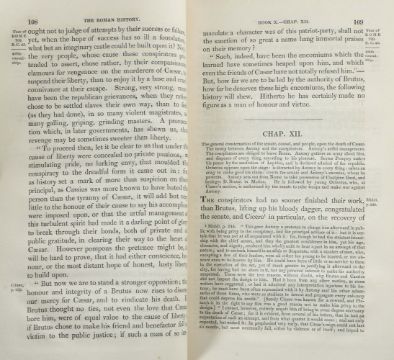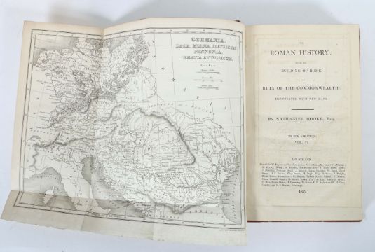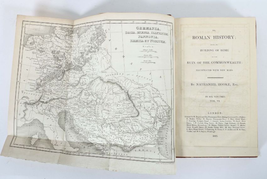 The Roman History; From The Building Of Rome To The Ruin Of The Commonwealth: Illustrated With New Maps, London, 1825, 6 Bde., 540+606+642+586+622+536 S. inkl. Index, mit 8 mehfrach gefalteten Karten, goldgeprägte Halblederbände mit Rückentitel auf 5 Bünden, umgehend gesprenkelter Schnitt, Großoktav. Altersspuren, part. besch./fleckig, vereinzelt Paginierungsfehler.