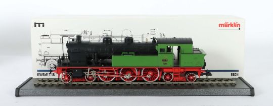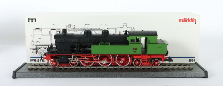Märklin, Spur 1, Nr. 5524, Königlich Württembergische Staatseisenbahnen, BR T18 der K.W.St.E., bez. T18 1127 Württemberg, Kunsstoff, grün/schwarz/rot, im OK, mit Schiene auf Sockel, Riemen und Schrauben, part. leichte Altersspuren, leicht bespielt, auf Funktion nicht geprüft, Karton mit Spuren und Druckstelle.