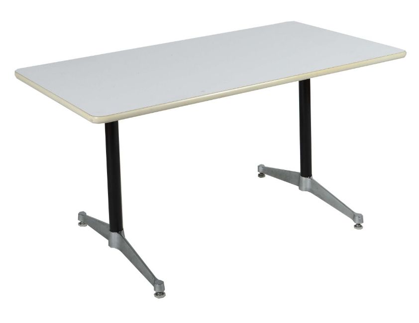 Hartford, USA 1908 - 1986 New York City, amerikanischer Architekt und Designer, rechteckiger Tisch, Ausführung: 1960er/70er Jahre, "Herman Miller" (Klebeetikett), Arbeitstisch, verchromte Aluminiumfüße auf Kunststoffgleitern, 2 schwarz lackierte Rohrstützen mit je 3 Auslegern für die Tischplatte, die Tischplatte weiß laminiert und mit cremefarbenem Gummi-Umleimer, HxBxT: 75/137/76 cm. Normale Gebrauchs- und Alters-/Oxydationsspuren.