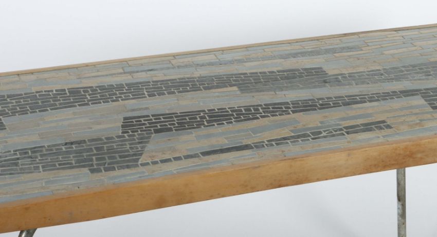 deutscher Kunsthandwerker, Mitte 20. Jh., Mosaiktisch, Ausführung: 1950/60 Jahre, Fa. Ritter, Großheppach, die Tischplatte mit Mosaikmusterung aus langgezogenen, keilartigen Flächen in einem Feld aus pastellblauen und beigefarbenen Steinen, Holzleisteneinrahmung, verchromtes Metallrohrgestell auf Kunststoffkappen, HxBxT: 55,5/118/43 cm. Alters- und Gebrauchsspuren, Gestell oxidiert.