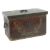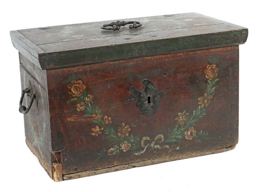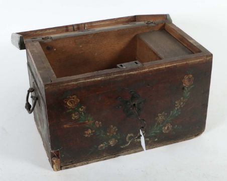 Anfang 19. Jh., Eiche, mit Blütengebinde und Lorbeerkränzen bemalte Flachdeckeltruhe, Klapphenkelgriffe, 1 Klappdeckelfach innen und 1 Geheimfach, HxBxT: 33/56/32 cm. Starke Alters- und Gebrauchsspuren, Trockenrisse, kl. Ausbrüche, Schloss locker und Griffe locker, Malerei berieben.