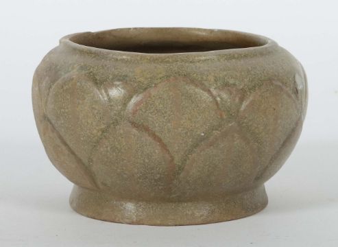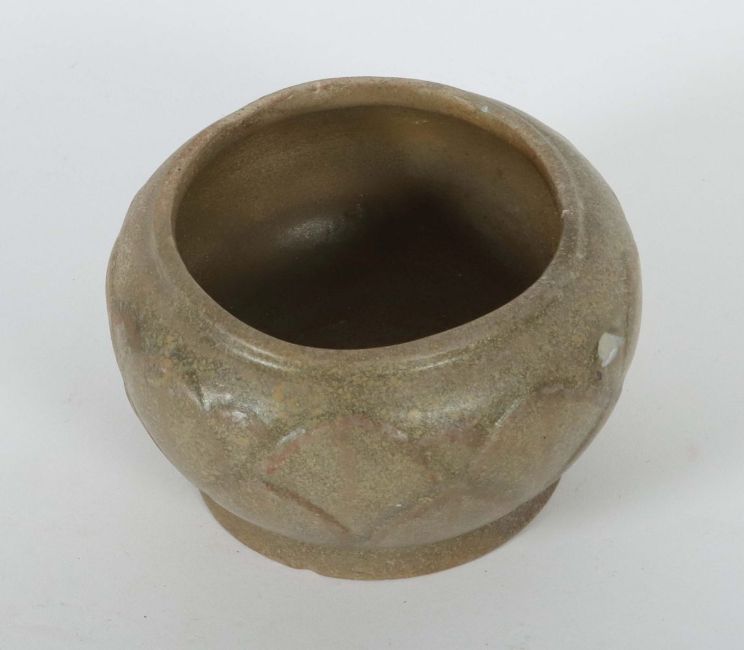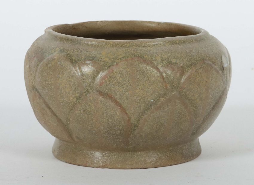 China, Five-Dynastie 907 - 960, Yue-Keramik, graubrauner Scherben, glasiert, gedrückte Kugelform auf leicht ausgestellter Standkante, die Wandung mit Blütenblattrelief einer Lotusblume, HxD: ca. 7,3/11,5 cm. Wandung mit Glasurchip. Provenienz: Bayerische Privatsammlung.
