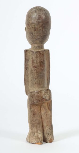 Burkina Faso u. a., Holz, gräuliche Patina mit tlw. braun glänzenden Partien, weibliche Standfigur mit geschlossenen Beinen und enganliegenden Armen, der Unterbauch mit einer mundähnlichen Quereinkerbung, spitzer Nabel, das Gesicht mit geschlossenem Augenschnitt und betonter Kinnlinie, H: 35,5 cm. Trockenrisse.