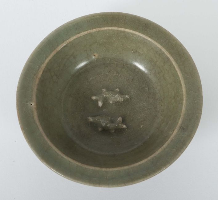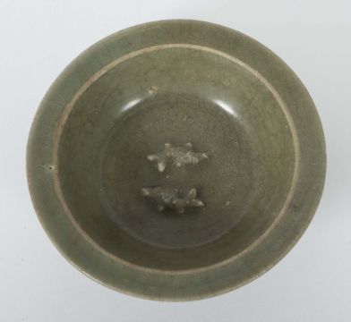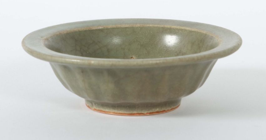 China, Song-Dynastie, 960 - 1279, Keramik, rotbeiger Scherben, glasiert, kurzer Standring, die Außenwandung gerippt in Form von Lotusblütenblättern, gerade Fahne, der Schalengrund mit zwei reliefierten gegenständigen Karpfen, HxD: ca. 4/12,6 cm. Provenienz: Bayerische Privatsammlung.