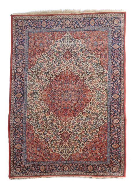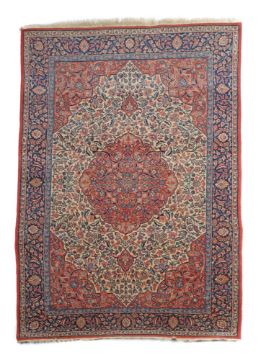 Nordwestpersien, um 1970, Wolle auf Baumwolle, Zentralmedaillon auf cremefarbenem Doppelnischenfeld mit dichtem Blütenrankenwerk, nachtblaue Hauptbordüre mit Palmettenranke, LxB: 205/132 cm. Kantenabnutzungen, stellenweise sehr dünn.