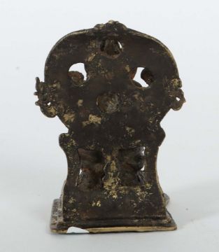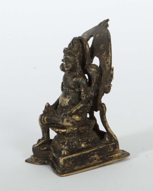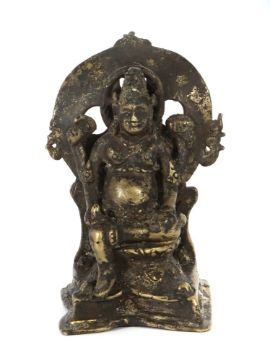 Indonesien, um 1300, Bronze, im Majapahit-Stil, vollplastische Skulptur auf Rechtecksockel mit Einsparungen, vierarmig, das linke Bein angewinkelt, in den Händen Attribute, vor Flammenschild, H: ca. 10 cm. Normale Altersspuren. Provenienz: Bayerische Privatsammlung.