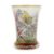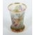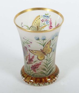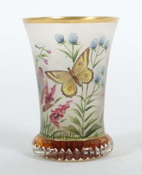 19./20. Jh., farbloses Glas, überwiegend matt geätzt, die sich nach unten verjüngende Wandung umlaufend mit Faltern zwischen Gräsern und Blumen, in feiner polychromer Emaillemalerei, der Mündungsrand mit Goldrand akzentuiert, der wulstige Standring mit Kerbschliff, mit Bodensternschliff in Gelb, seitlich Malerinitialen "TS", H: 11,5 cm. Part. min. Berieb, Aufkleberreste am Boden.