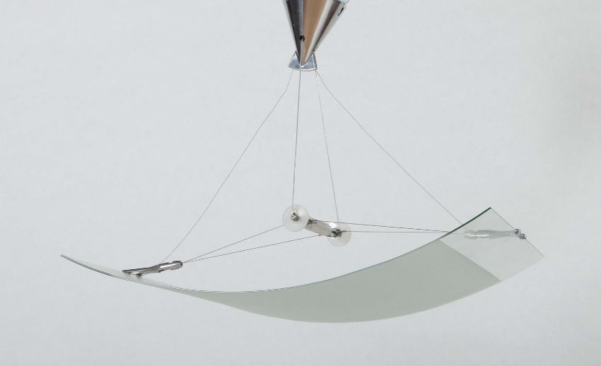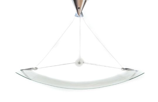 Italien, Pendelleuchte Modell "Velo" Nr. 2791, Entwurf: 1988, Ausführung: wohl 1990er Jahre, Fontana Arte, Mailand, Konstruktion aus Drahtseil, Aluminium, Kunststoff, Aufhängung einer gewölbten und großteils satinierten Glasscheibe als Diffusor, HxBxT: 65/60/77 cm. Funktionstüchtig.