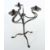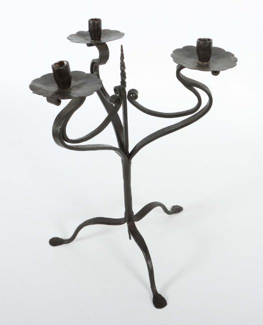 20. Jh., Kunstschmiedeeisen, dreibeiniger Kerzenständer, dreiflammig mit Kerzentüllen auf blütenförmigen Tropfschalen, H: 48 cm.