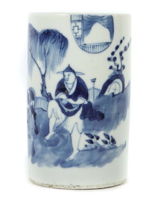 China, Qing-Dynastie, 19. Jh., Porzellan, Zylinderform, Unterglasurdekor in Blau, Dekor mit Pferdehüter und Pferd auf Landschaftssockel, ungemarkt, H: ca. 12,7 cm. Provenienz: Bayerische Privatsammlung.