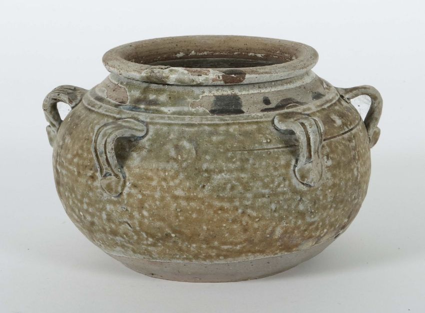 China, Song-Dynastie, 960 - 1279, Steingut, zu 2/3 glasiert, gedrückte Kugelform über leicht gewölbtem Boden, sechs alternierende Henkel, umgelappter Mündungsrand, HxD: ca. 11,5/17,8 cm. Standkante min. best.. Provenienz: Bayerische Privatsammlung.