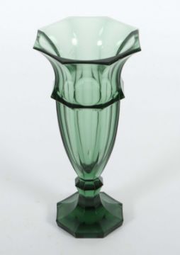 Moser, Karlsbad, Böhmen (?), nach 1900, grün eingefärbtes Glas, die Vase mit facettierter Wandung, der Korpus sich nach unten hin verjüngend, mit ausschwingender Mündung, der Stand nodiert, bodenseitig ungemarkt, H: ca. 27,5 cm. Part. min. Alters- und Gebrauchsspuren, part. ber. und best.
