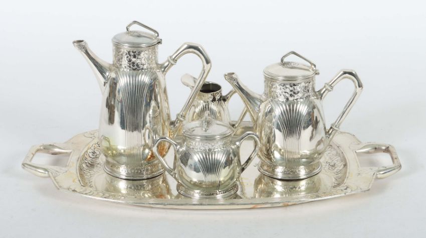Urania, Holland, Anfang 20. Jh., Zinn poliert: 5-tlg. best. aus: Kaffeekanne, Teekanne, Milchkännchen, Zuckerdose und Tablett mit seitlichen Handhaben, die Wandungen der gebauchten Korpusse mit reliefplastischem Dekor, die Henkel der Kannen mit Isolationsringen, je gemarkt und num., H: ca. 20,5 cm (Kaffeekanne gesamt), LxB: ca. 51/27,5 cm. Alters- und Kratzspuren, fleckig, Scharnierdeckel der Kaffeekanne besch.