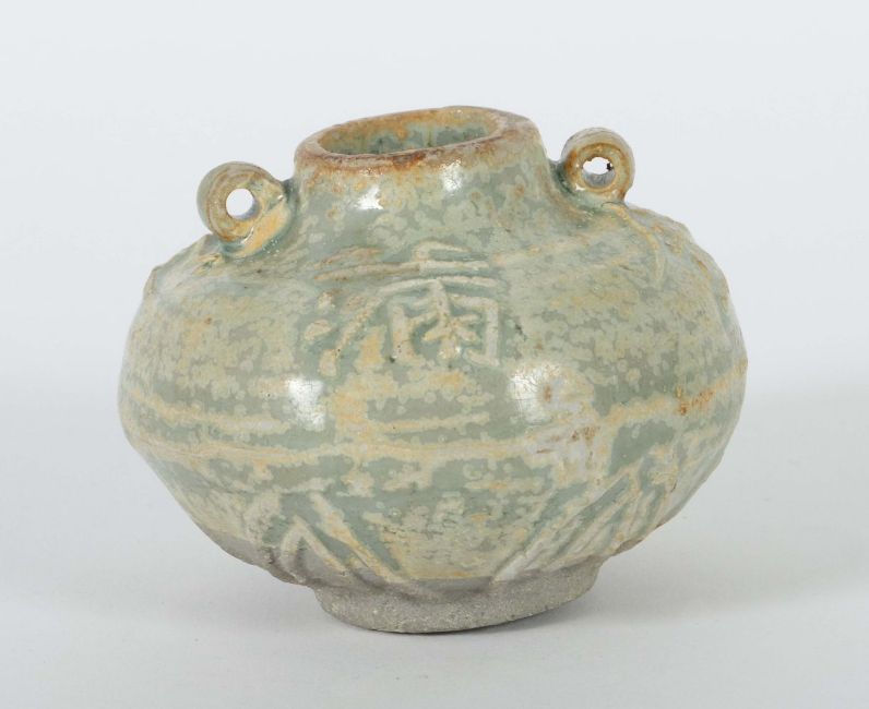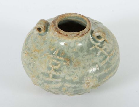 China, Tang-Dynastie, 617 - 907, Steingut, grauer Scherben, glasiert, gedrückte Kugelform auf kurzer Standkante, Gefäßansatz mit hochreliefierten Blütenblättern, darüber Rillen und vier erhabene Schriftzeichen, HxD: ca. 6/7,2 cm. Provenienz: Bayerische Privatsammlung.