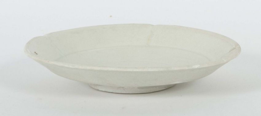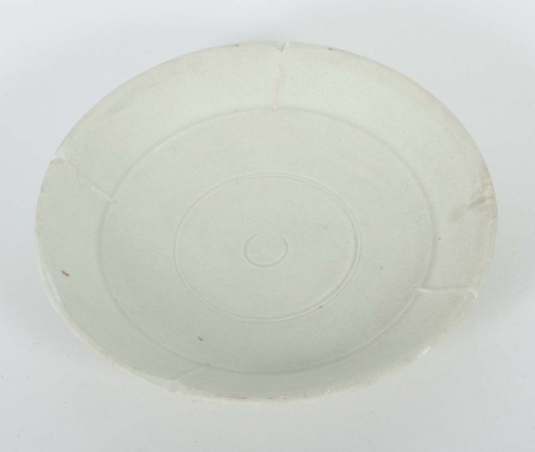 China, Tang-Dynastie, 617 - 907, Ding-Ware, weißer Scherben, glasiert, leicht ansteigender Boden über kurzem Standring, geritztes Kreisdekor, die schräge Fahne vierfach gekantet, HxD: ca. 2,5/14,5 cm. Min. best. Provenienz: Bayerische Privatsammlung.