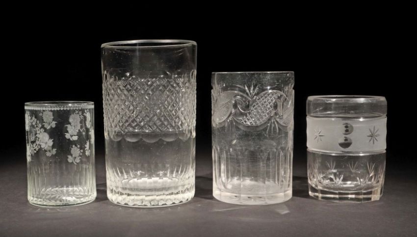 19. Jh., farbloses Kristallglas, 3x dickwandig, Schliffdekor, der dünnwandige Becher mit Monogramm "AV" und geschliffener Blumendekoration, H: bis 14,7 cm.