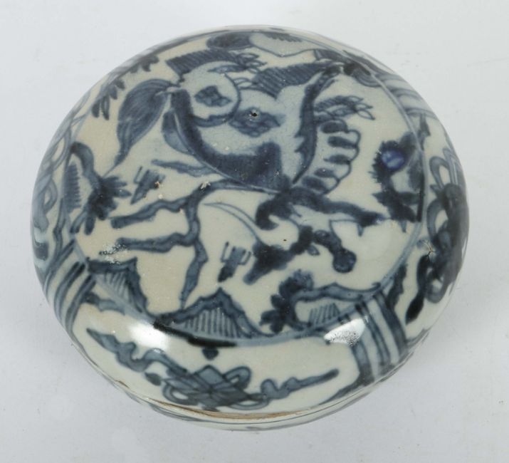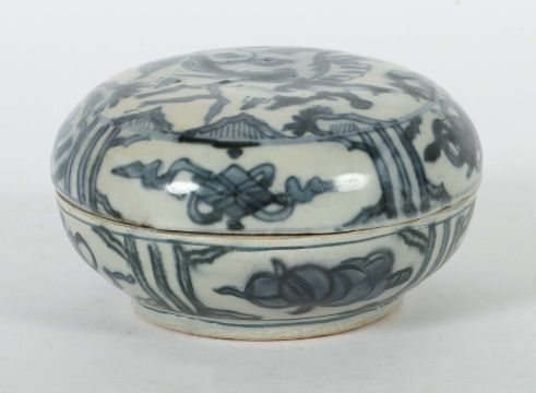 China, Ming-Dynastie, 1368 - 1644, Wanli-Periode, Steingut, braun-roter Scherben, glasiert, vollflächig blaue, florale Unterglasurmalerei mit Früchten, Gefäß auf kurzem Standring, HxD: ca. 7,2/12,5 cm. Geringe Altersspuren. Provenienz: Bayerische Privatsammlung.