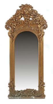 20. Jh., bronzierter Holzrahmen mit Fußleiste und Rundbogen, verziert mit Rocaillen, Früchten, Weintrauben und Blattwerk in Stuckdekor, HxB: 172/79 cm. Abplatzer und Trockenrisse.