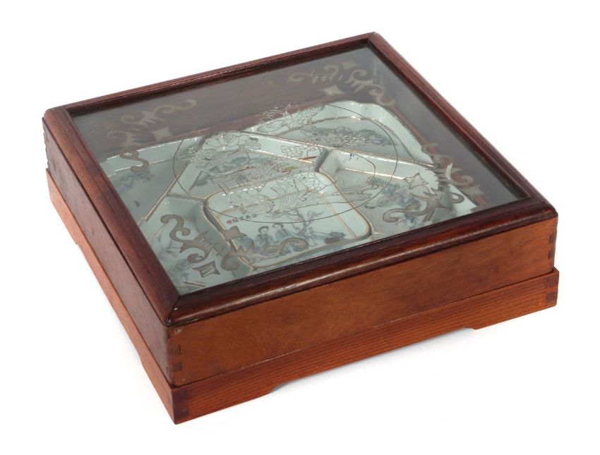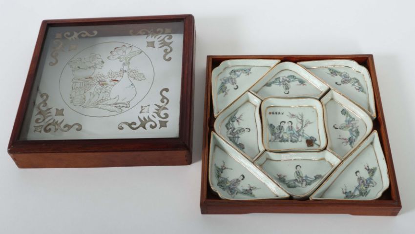 China, Anfang 20. Jh., neunteiliges Schalenset aus Porzellan, Aufglasurmalerei mit Personenstaffage, die mittlere Schale mit Schriftzeichen und Lacksiegel, quadratischer Holzkasten mit Sichtfenster, HxBxT: ca. 28/28/9 cm.