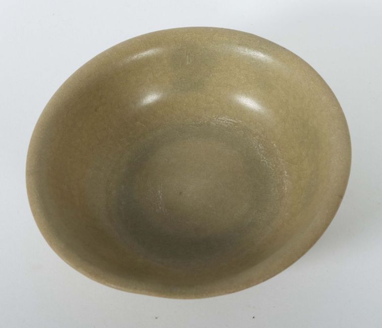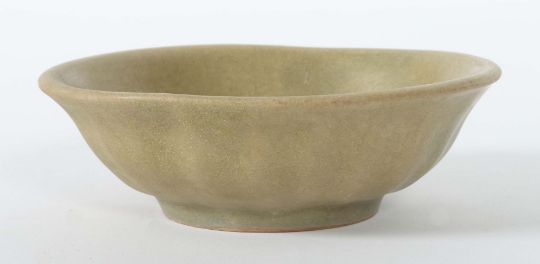 China, Song-Dynastie, 960 - 1279, Keramik, rotbrauner Scherben, seladonfarben glasiert, die Außenwandung gerippt in Form von Lotusblütenblättern, kurzer Standring, ausgestellte Wandungsmündung, HxD: ca. 4,6/14,9 cm. Provenienz: Bayerische Privatsammlung.