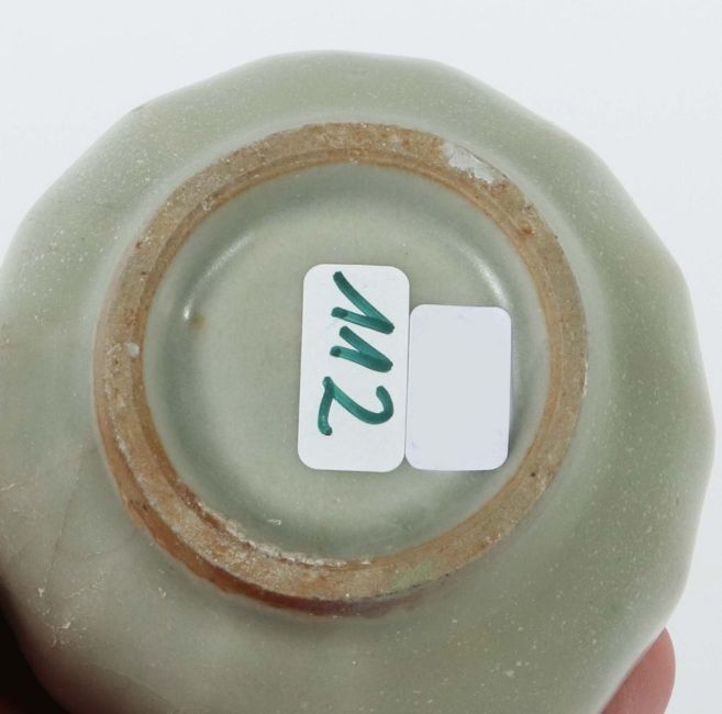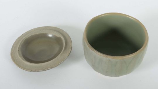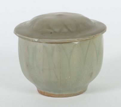 China, Song-Dynastie, 690 - 1279, Keramik, seladonfarben glasiert, leicht gerippte Wandung mit Unterglasurdekor von Lotusblütenblättern, der Deckel mit reliefierter Lotusblüte, HxD: ca. 7,5/8,3 cm. Haarrisse. Provenienz: Bayerische Privatsammlung.