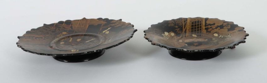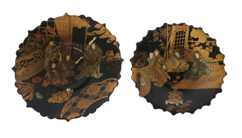 Japan, Mitte 20. Jh., goldbedrucktes Dekor auf schwarzem Grund, Motiv mit häuslichen Szenen, D: bis 23,5 cm. Der große Teller partiell berieben.