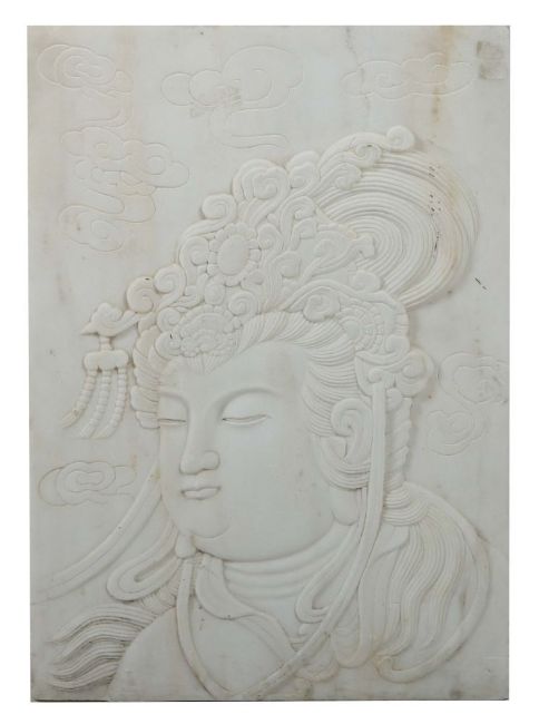 China, 20. Jh., weiße Marmorplatte, Ganzfigurendarstellung der Göttin im Flachrelief, umgeben von Wolkengebilden, HxB: 101/61 cm. Chips, 1 Ecke mit kleinem Ausbruch.