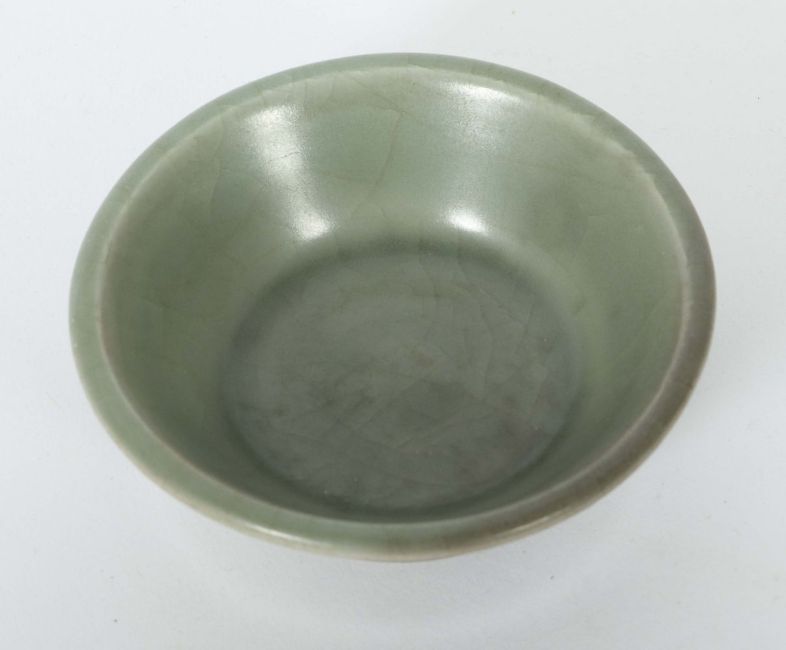 China, Song-Dynastie, 960 - 1279, Keramik, beiger Scherben, seladonfarben glasiert, grobes Craquelée, kurzer Stand unter eingezogener, konkaver Gefäßwandung, Mündungsrand leicht ausgestellt, HxD: ca. 3,2/8,8 cm. Provenienz: Bayerische Privatsammlung.