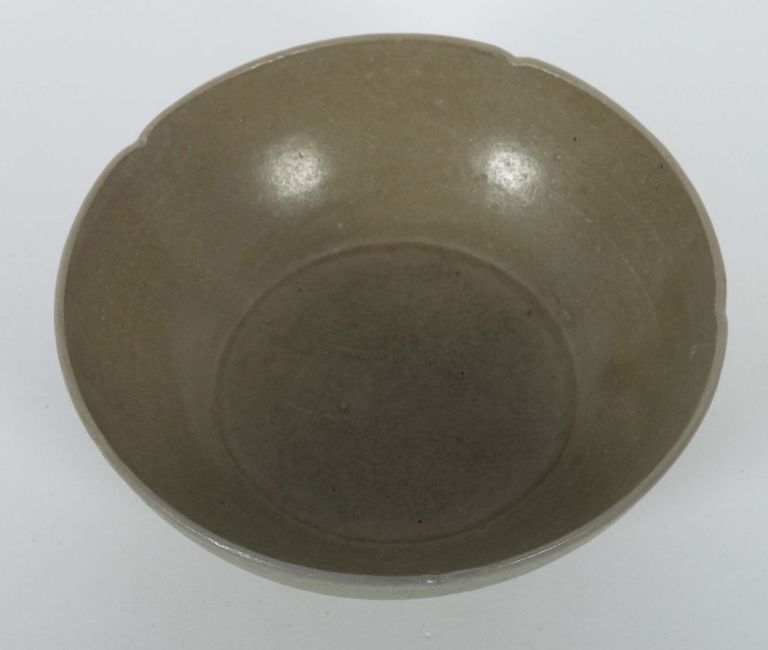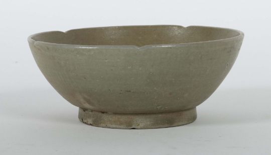 China, Five-Dynastie, 907 - 960, Yue-Ware, Keramik, glasiert, grauer Scherben, über leicht ausgestelltem Standring sich erweiternde, glatte Wandung, der Mündungsrand vierfach eingekniffen, im Schalengrund ein Ritzdekor mit zwei gespiegelten Schmetterlingen (Faltern), HxD: ca. 6/15 cm. Provenienz: Bayerische Privatsammlung.