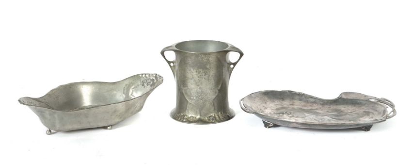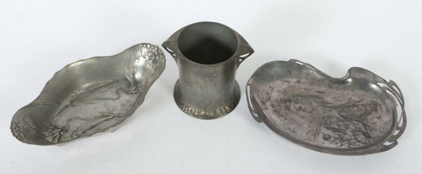Deutschland, um 1900/Anfang 20. Jh., 3-tlg. best. aus: längsoval geschweifter Anbietschale, Osiris, num. 540; nierenfömig geschweifte Schale; zylindrisches Gefäß (Deckel fehlend), Kayserzinn, num. 4505, variierende reliefplastische Dekore, HxL: bis ca. 11,5/26 cm. Altersspuren, vereinzelt Dellen.