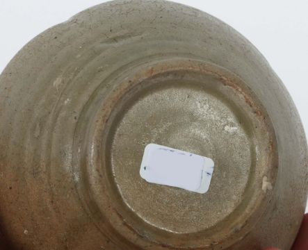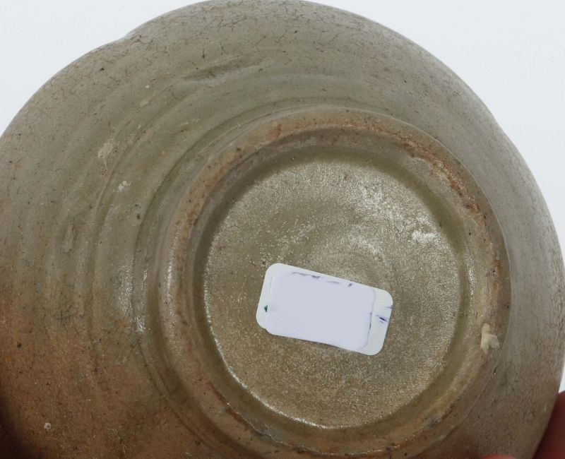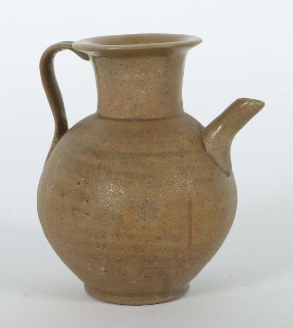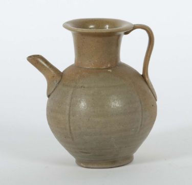 China, Tang bis nördliche Song-Dynastie, 617 - 1126, Provinz Zhejiang, wohl Shanglinhu-Brennöfen, Yue-Ware, Steingut, glasiert, Korpus in Kugelform mit horizontalen Rippen und drei vertikalen Rippen, Henkel in Zungenform, Gefäß auf Standkante, H: ca. 13 cm. Provenienz: Bayerische Privatsammlung.