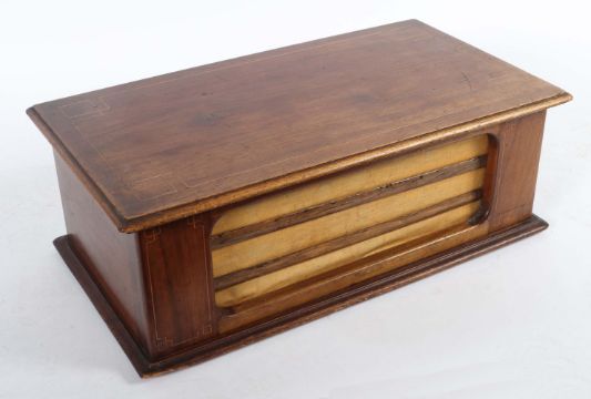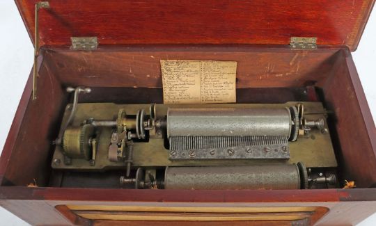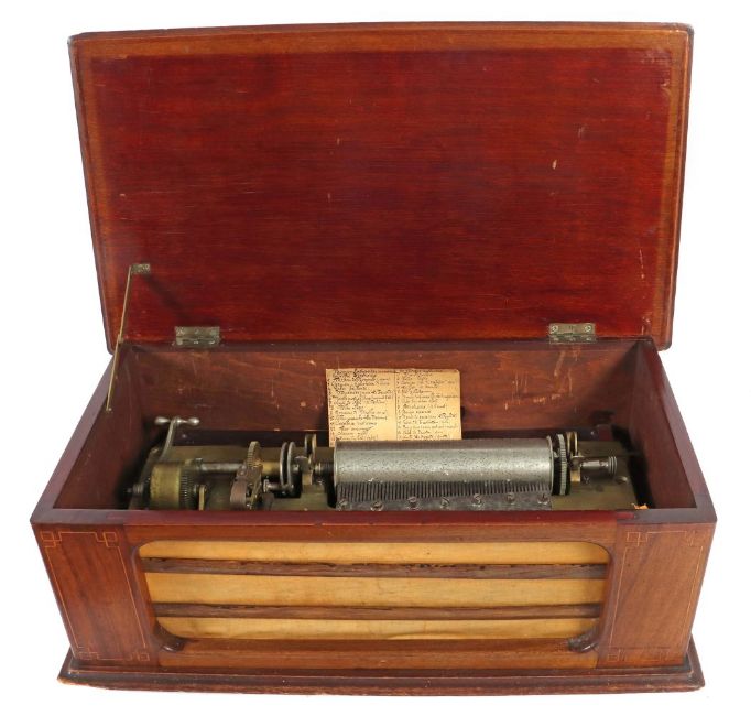 Schweiz/Frankreich, um 1890/1900, rechteckiger Holzkorpus mit abgerundeten Ecken und Fadenintarsien, flacher Scharnierdeckel, schauseitiger Stoffschirm, 2 Walzen mit je 16 Melodien, Stahlkamm, Kurbelaufzug und Regler, mit handschriftlichem Zettel die Melodien aufführend, voll funktionstüchtig, sehr schöner Klang, BxTxH: ca. 68/38/23,5 cm. Altersspuren, part. besch./fleckig.