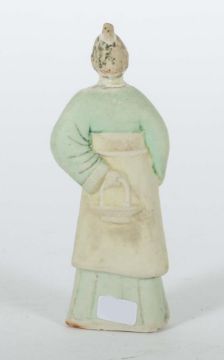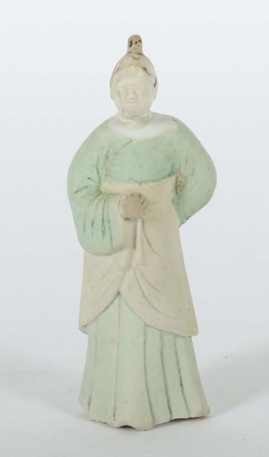 China, Song-Dynastie, 960 - 1279, Feinsteinzeug, matt glasiert, vollplastische stehende Figur, eine Bügelschale auf dem Rücken haltend, H: ca. 12 cm. Hals geklebt. Provenienz: Bayerische Privatsammlung.