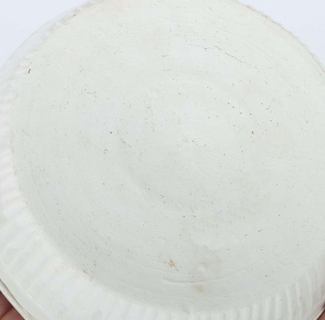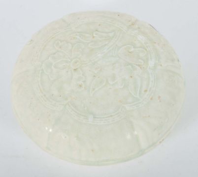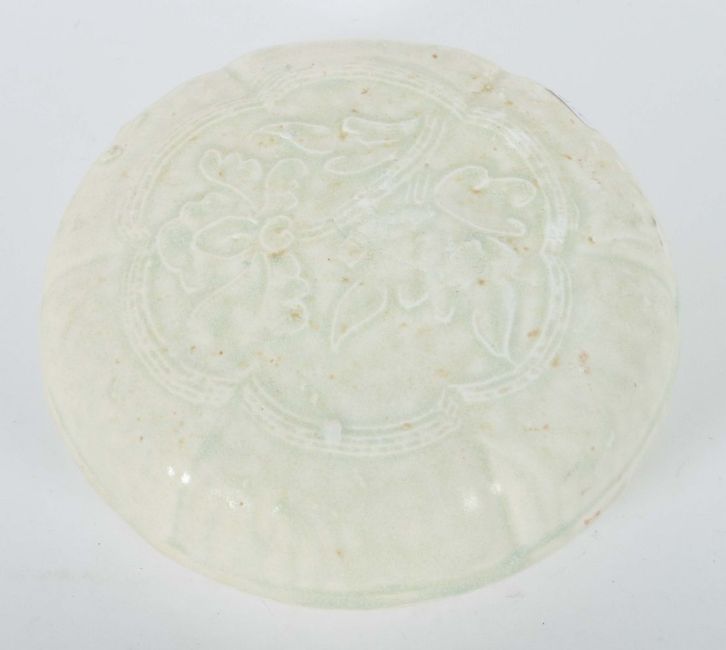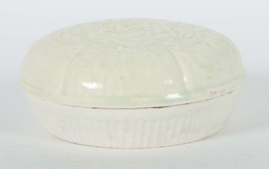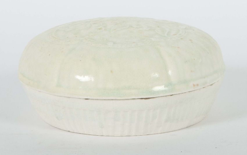 China, Song-Dynastie, 960 - 1279, Feinsteinzeug, zu 3/4 glasiert, Unterteil mit geriffelter Wandung, der sechsfach eingekantete Deckel mit zentralem Blumenmotiv, HxD: ca. 7/14,3 cm. Geringe Alters- und Gebrauchsspuren. Proveneinz: Bayerische Privatsammlung.