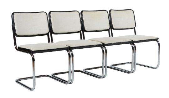 1899 - 1986, niederländischer Architekt und Designer, Satz aus 4 Freischwinger-Stahlrohrstühlen S43 PV, ursprünglicher Entwurf: 1920er Jahre, Ausführung: wohl 1980er, Thonet, Frankenberg, verchromtes Stahlrohrgestell ohne Gleiter, Sitz und Rückenlehne mit schwarz gebeiztem Buchenrahmen, Sitzbezug aus cremeweißem Textilgewebe, H: 80 cm. Alters- und Gebrauchsspuren, Sitzbezüge tlw. verschlissen, mit kleineren Flecken und Verfärbungen.