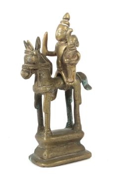 Indien, 18. Jh., Messing, zweiteilig gesteckt, Khandoba mit einem Schwert in der rechten und einer Schale in der linken Hand, auf abgetrepptem Sockel, H: ca. 16 cm. Die Figur mit starke, Abrieb, am Sockel korrodiert. Provenienz: Privatsammlung Baden Württemberg, vor 1977 erworben.